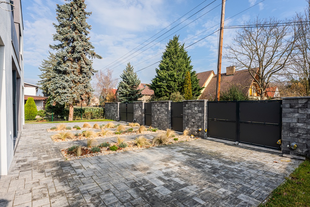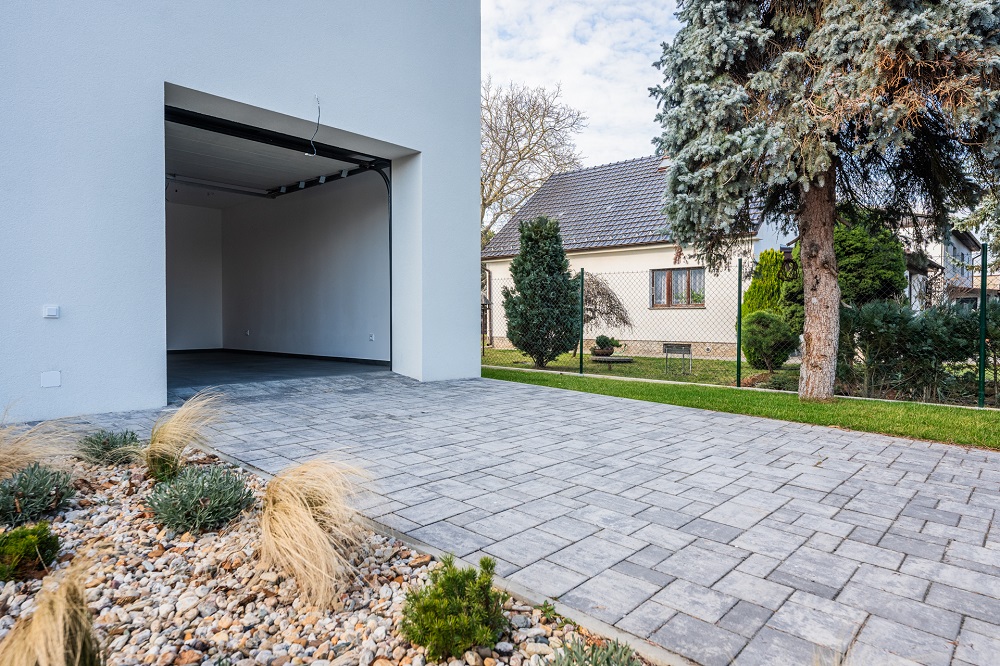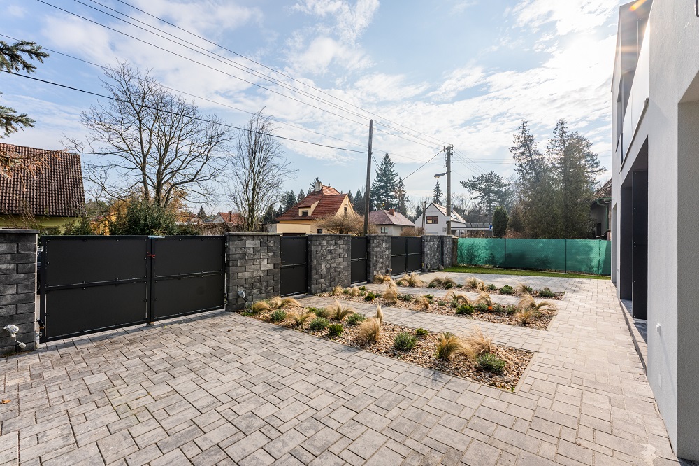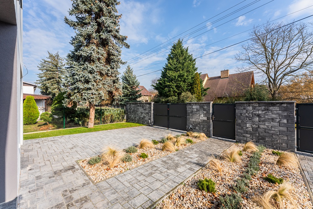 - Parkovací stání: Zámková dlažba ohraničená obrubníkem.