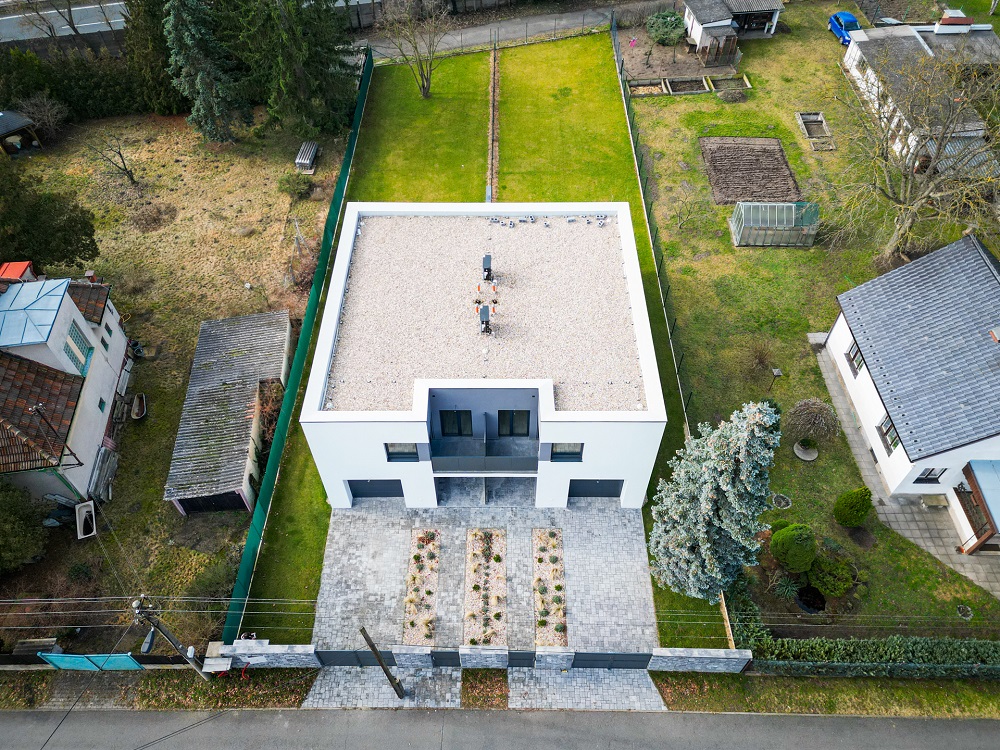 - Nepochozí plochá střecha je odvodněna do dvou zadních vpustí ve spádu min. 3%.